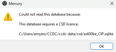 This error message appears when you have activated Mercury with a free CSD-Community licence but have installed the full CSD database which requires you to buy a licence. While the 2023 installer offers the option of installing only CSD-Community products, it does not prevent users from installing software or data which they are not licensed to use.